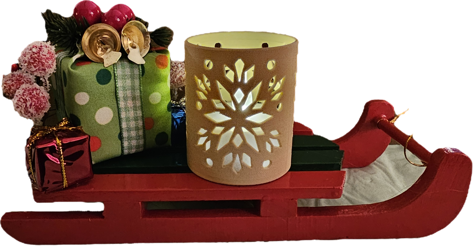 The wooden Christmas sleigh features a variety of presents, greenery, and a tealight to add to your holiday decor!