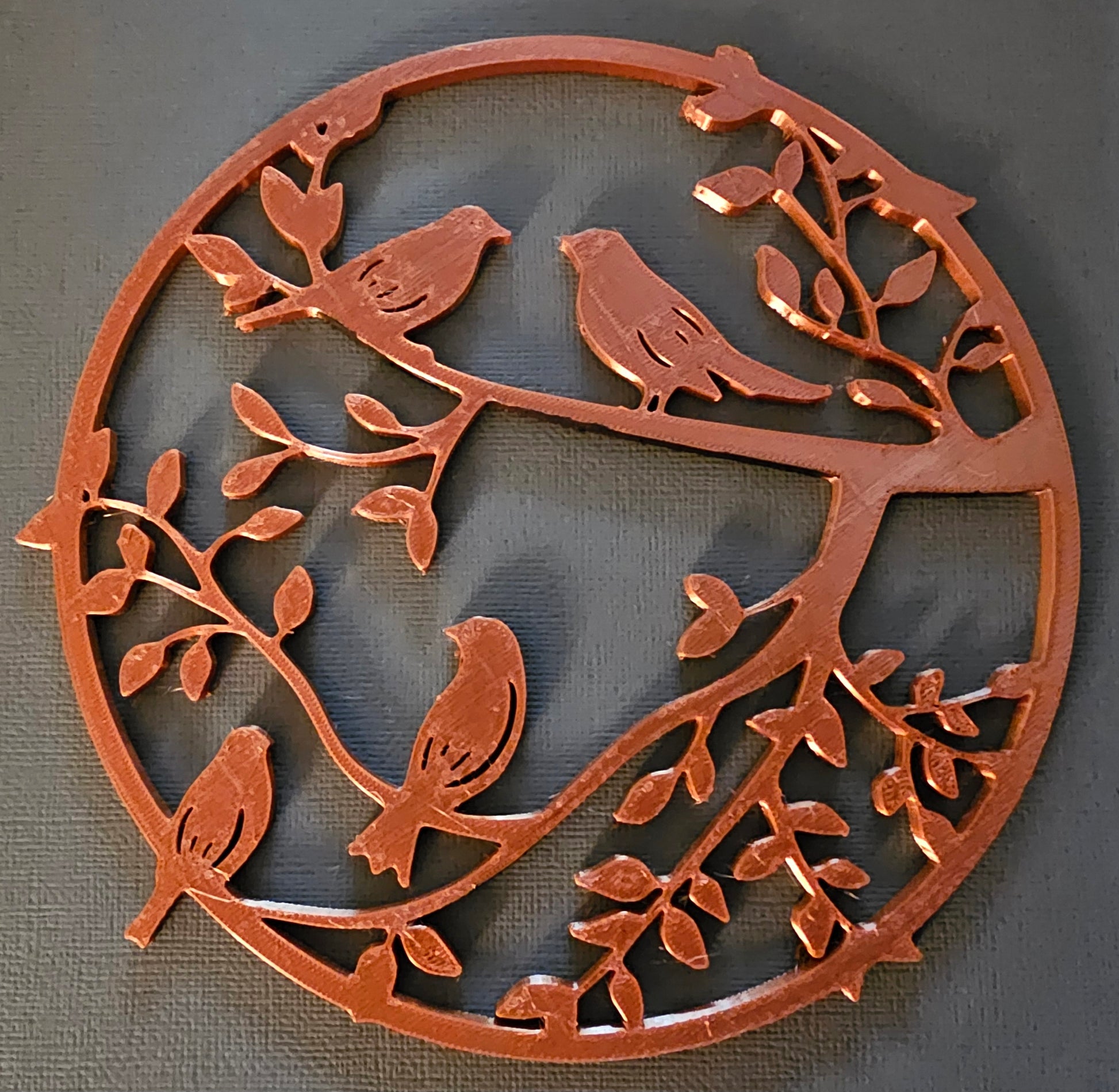 This handmade wall art features four birds on branches, created using 3D printing with a copper finish and black accents. Made from PLA material this piece adds a unique touch to any space with its artistic design and intricate details.