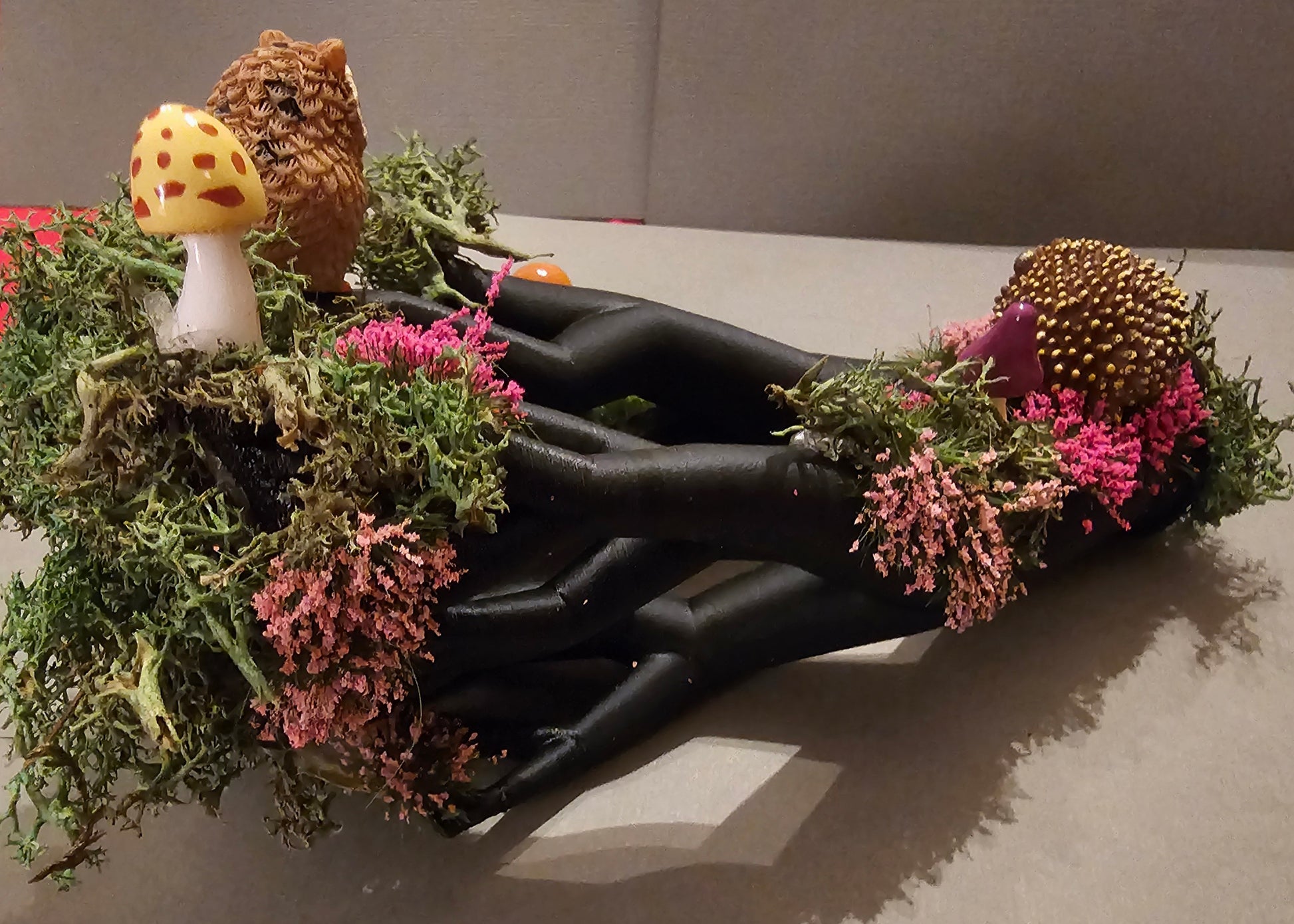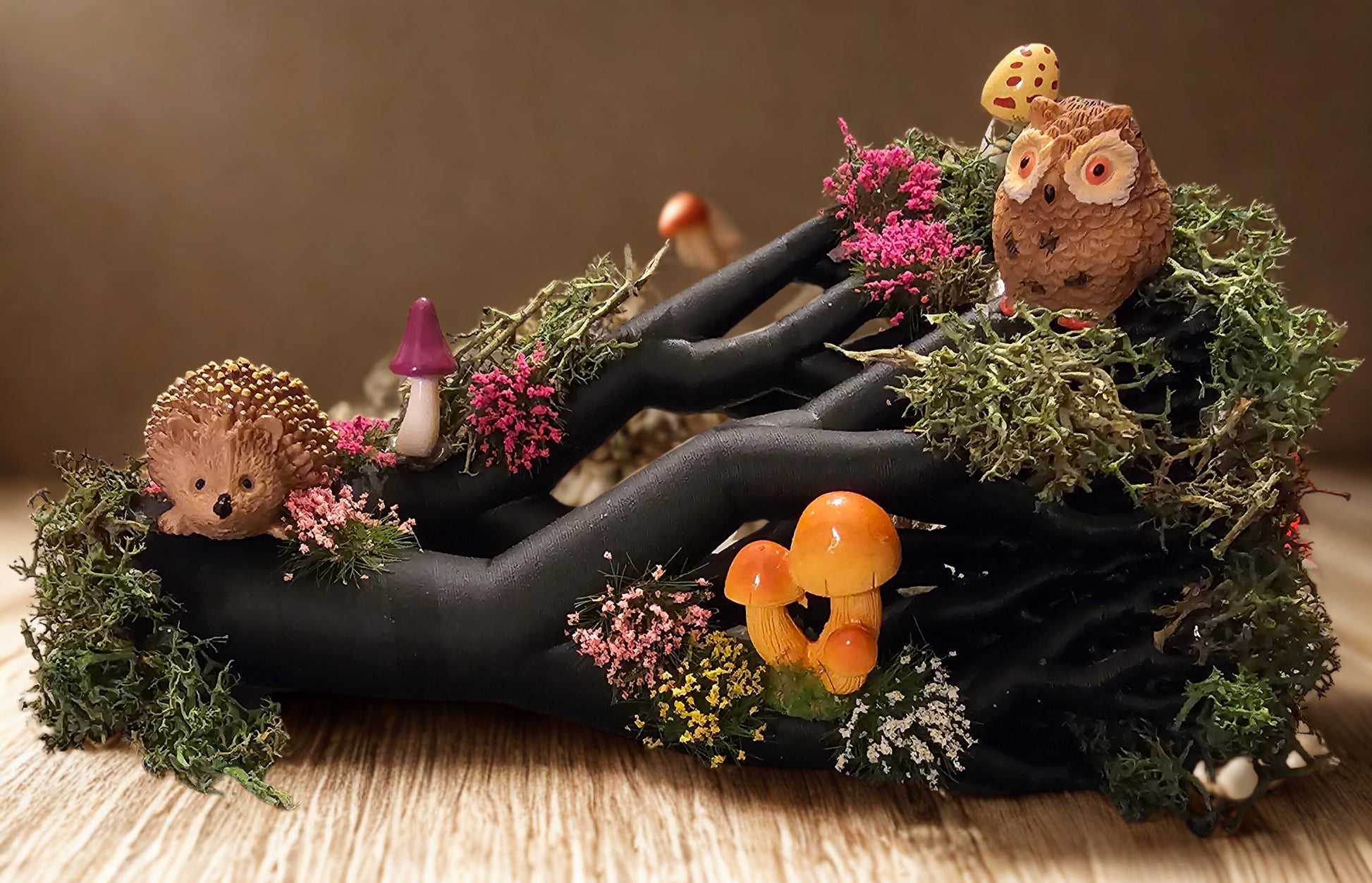 A truly unique woodland scene featuring wildlife, mushrooms, and a variety of mosses!! Item is created from new and up-cycled materials. This is a gift for the nature lover or just to add to your home decor.