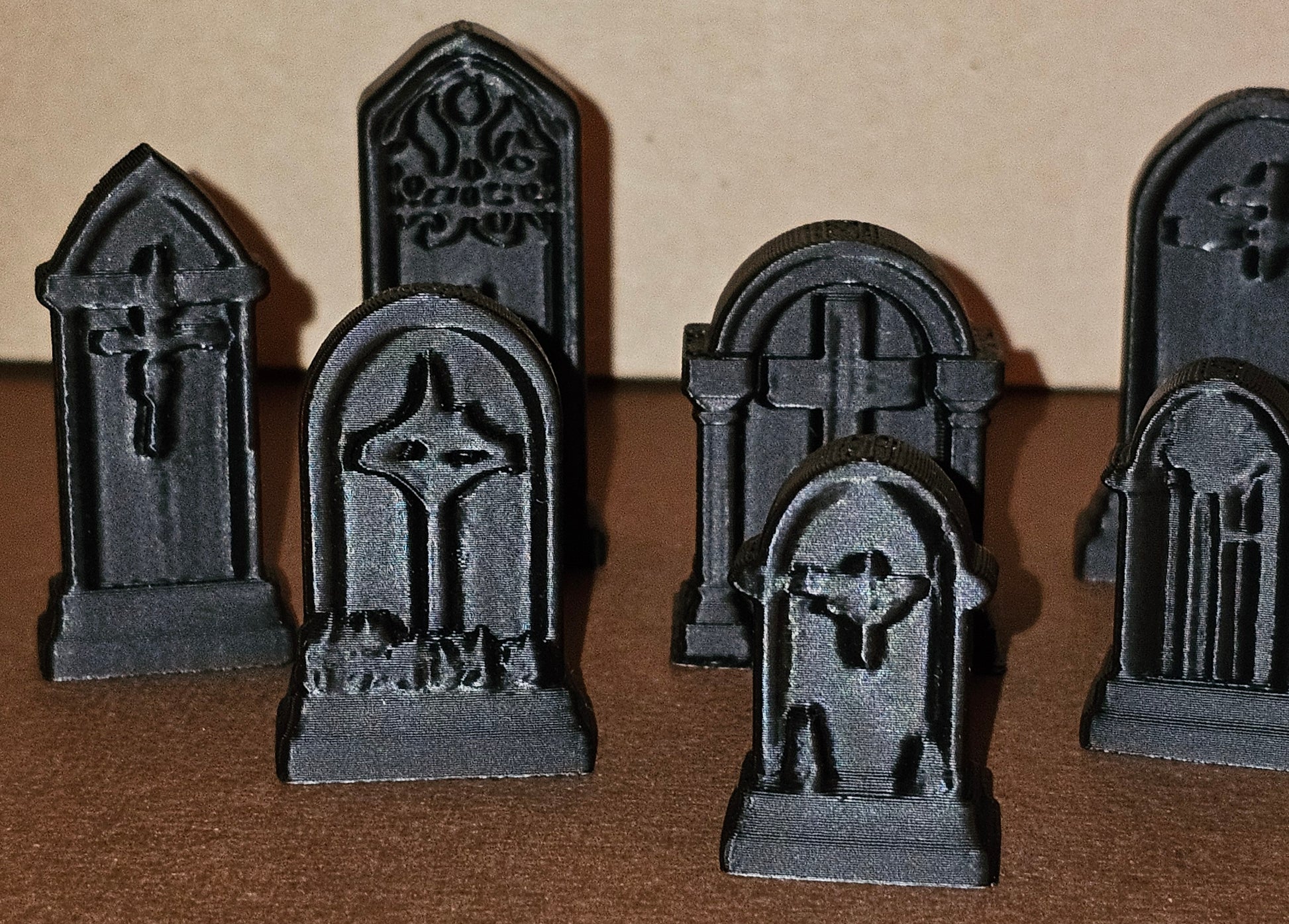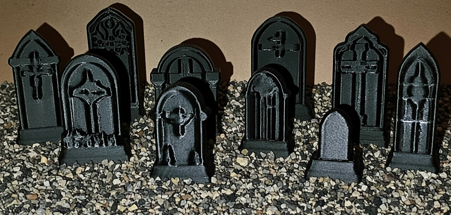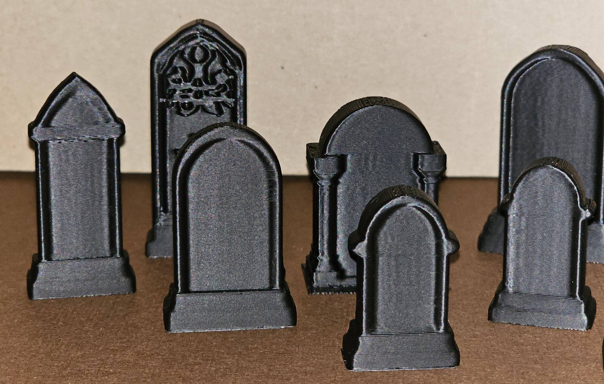 This Tombstone Collection features a set of ten different designs and has a variety of uses. Sizes range from 1/2" to 2" tall and are made of PLA in black. The pictures depict the front and back designs.
